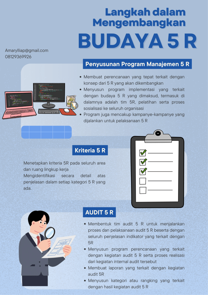 Pelaksanaan 5 R (Ringkas, Rapi, Resik, Rawat, dan Rajin) adalah salah satu pengembangan budaya positif dalam meningkatkan profesionalisme di dalam perusahaan. Mengimplementasikan 5 R itu sendiri tidak hanya dijalankan dengan membuat slogan atau informasi yang disampaikan kepada karyawan. Sangat diperlukan pendekatan yang sistematis dan terstruktur untuk memastikan budaya 5 R itu sendiri.