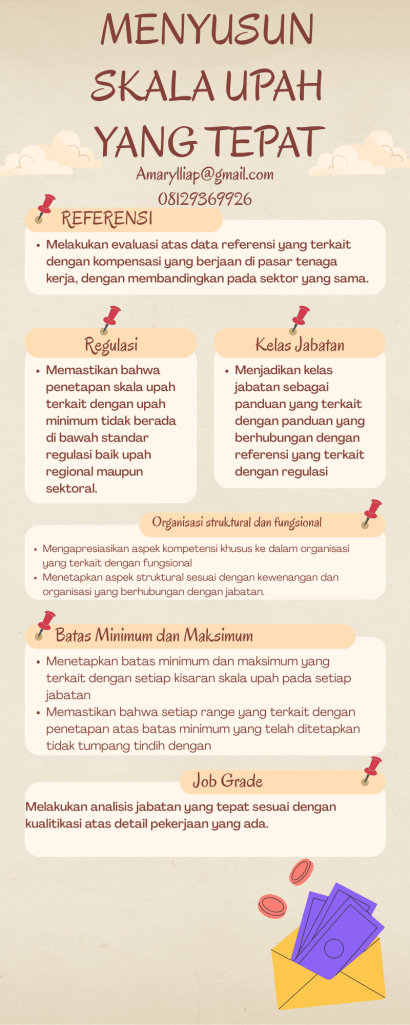 Lakukan proses penyusunan skala upah yang tepat sesuai dengan karakteristik perusahaan/organisasi. Kembangkan proses penyusunan skala upah dengan memastikan bahwa langkah-langkah yang terkait dengan pengembangan sistem remunerasi. Lakukan penggunaan referensi eksternal yang tepat untuk dapat mengembangkan sistem skala upah di dalam perusahaan/organisasi. (amarylliap@gmail.com, 08129369926)