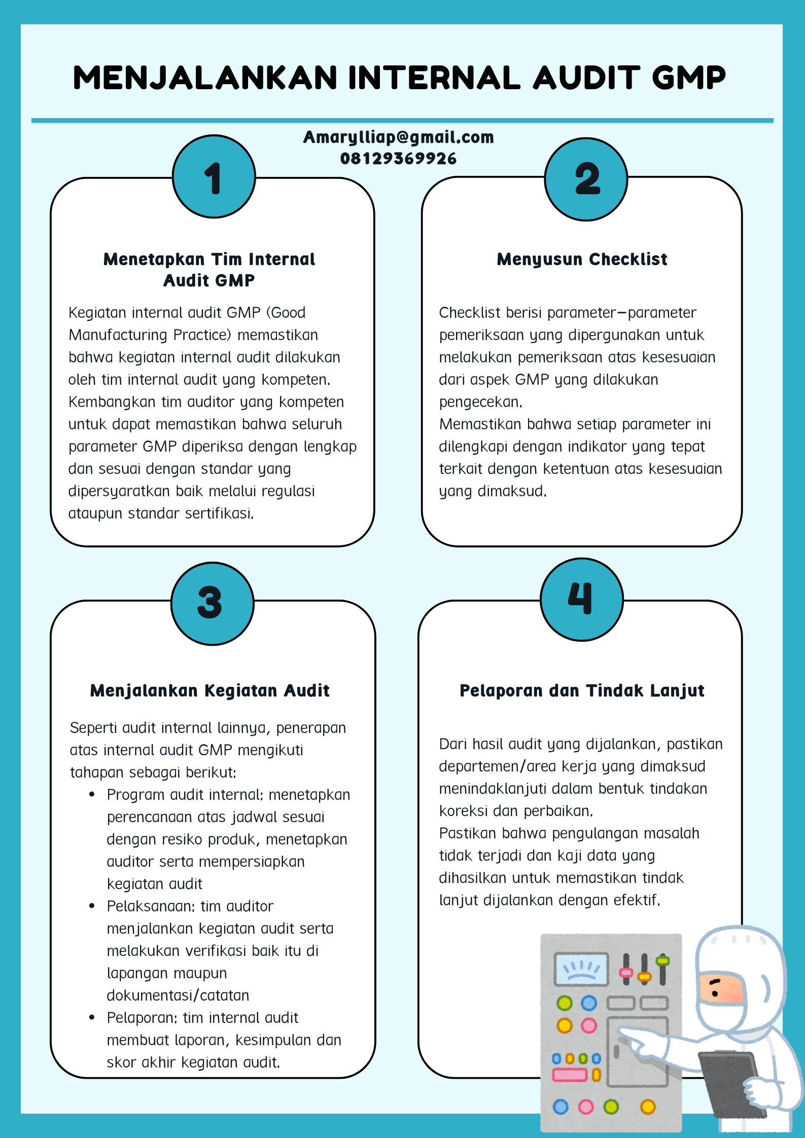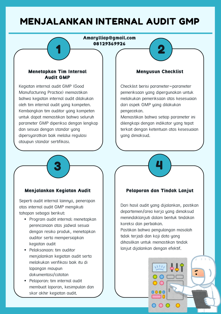 Dalam pelaksanaan Sistem Manajemen Keamanan Pangan, kegiatan internal audit GMP (Good Manufacturing Practice) adalah wajib untuk dijalankan. Penetapan atas internal audit GMP dapat dilaukan dengan periode waktu yang disesuaikan dengan resiko produk. Untuk dapat menjalankan kegiatan internal audit GMP yang efektif, berikut ini adalah tahapan-tahapan yang dapat dijalankan.