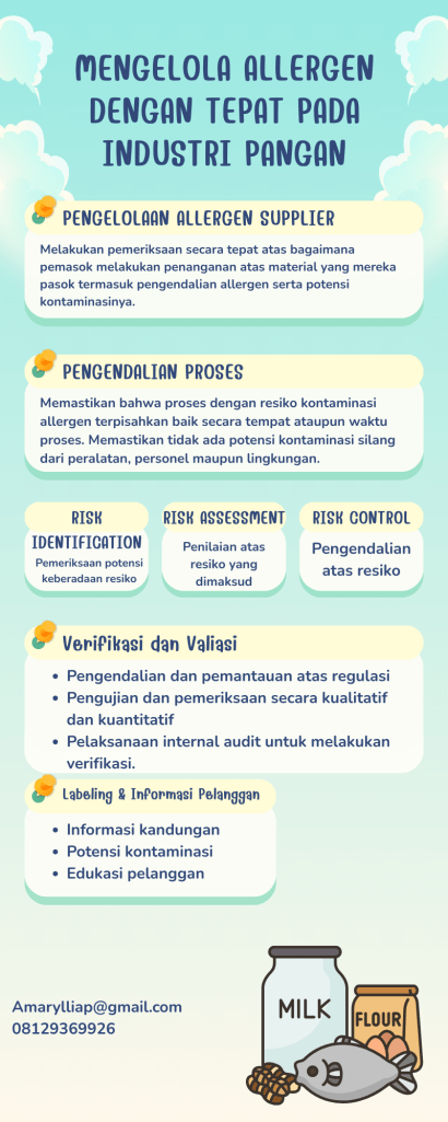 Ada baiknya perusahaan menjalankan seluruh pengendalian secara terdokumentasi serta dilengkapi dengan bukti implementasinya. Penggunaan konsultan yang telah berpengalaman di dalam industri pangan, dapat membantu perusahaan dalam menjalankan proses pengendalian allergen yang dimaksud. (Amarylliap@gmail.com, 08129369926)