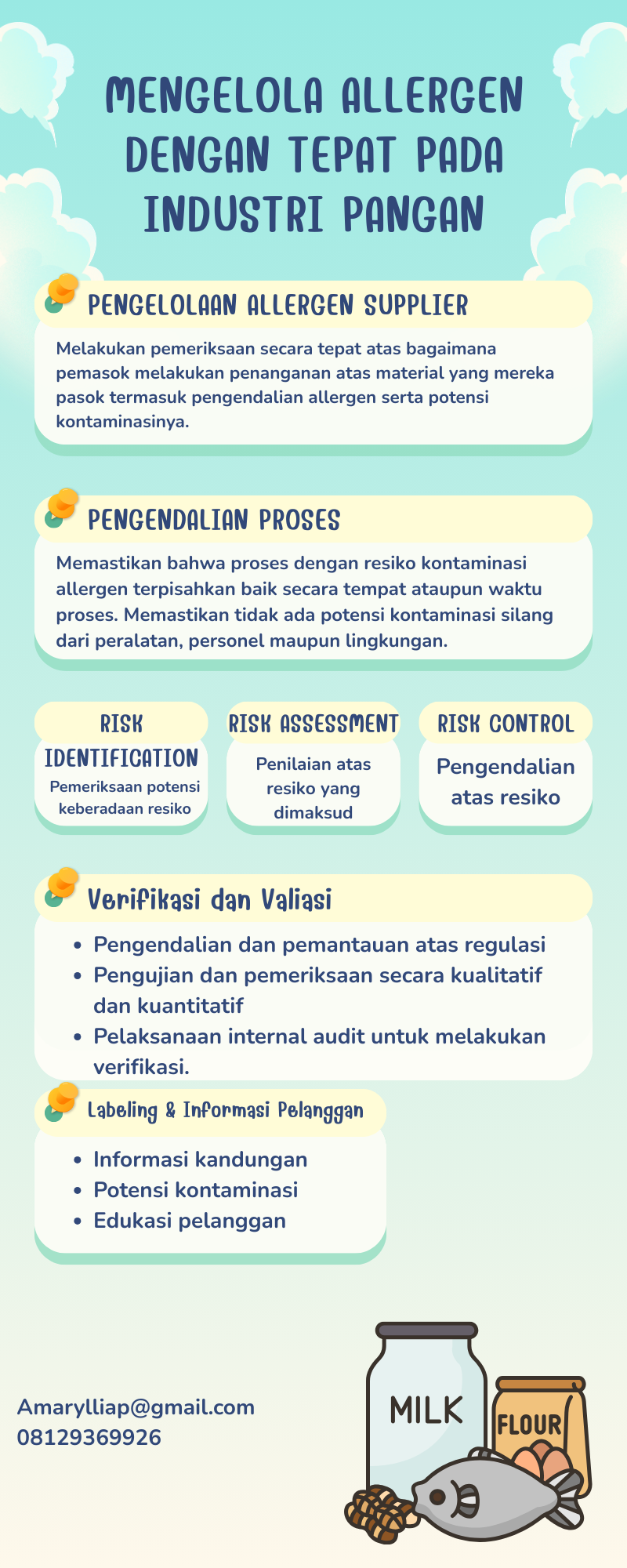Ada baiknya perusahaan menjalankan seluruh pengendalian secara terdokumentasi serta dilengkapi dengan bukti implementasinya. Penggunaan konsultan yang telah berpengalaman di dalam industri pangan, dapat membantu perusahaan dalam menjalankan proses pengendalian allergen yang dimaksud. (Amarylliap@gmail.com, 08129369926)