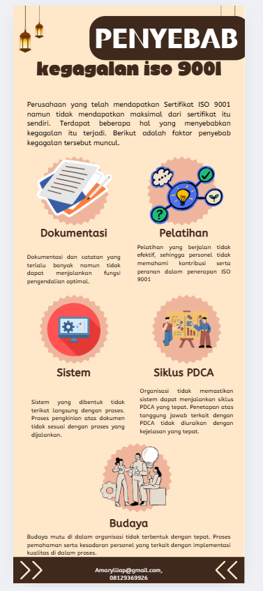 Untuk mendapatkan hasil yang maksimal dari sertifikasi ISO 9001, ada baiknya perusahaan memahami beberapa hal yang menyebabkan kegagalan ISO 9001. Dengan tujuan proses penanganan selanjutnya bisa mengantisipasi kegagalan yang muncul.