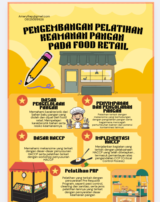 Pengembangan food retail saat ini mengalami peningkatan bisnis yang positif. Namun di balik pertumbuhan tersebut, terdapat bom waktu yang dapat muncul yaitu resiko keamanan pangan. Untuk dapat menjamin persyaratan keamanan pangan, program pelatihan keamanan pangan dapat dikembangkan. Dengan tujuan untuk memastikan bahwa kesadaran personel untuk menjamin terkait dengan pengendalian atas penanganan bahan pangan serta pengolahan yang tepat untuk mencegah adanya kontaminasi.
